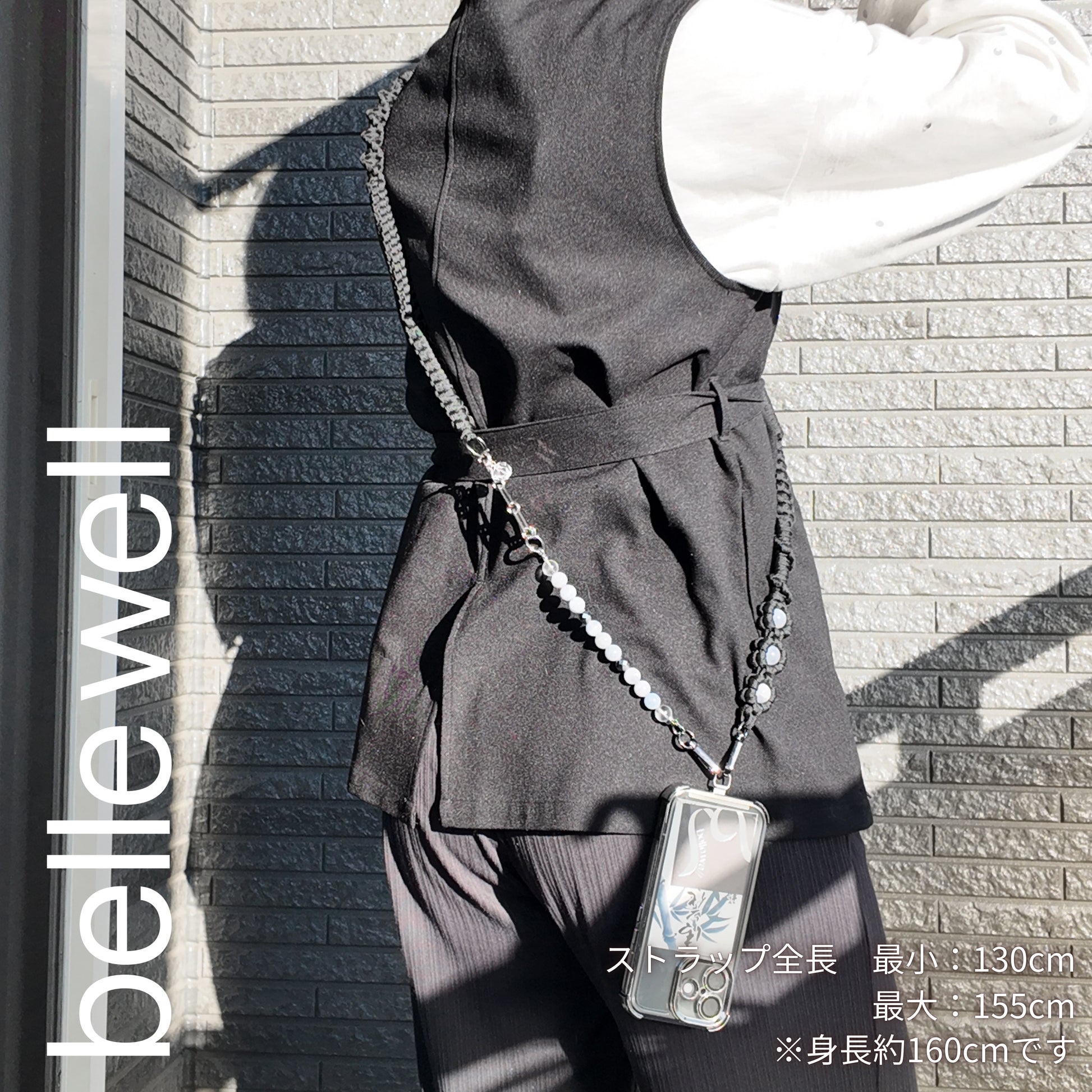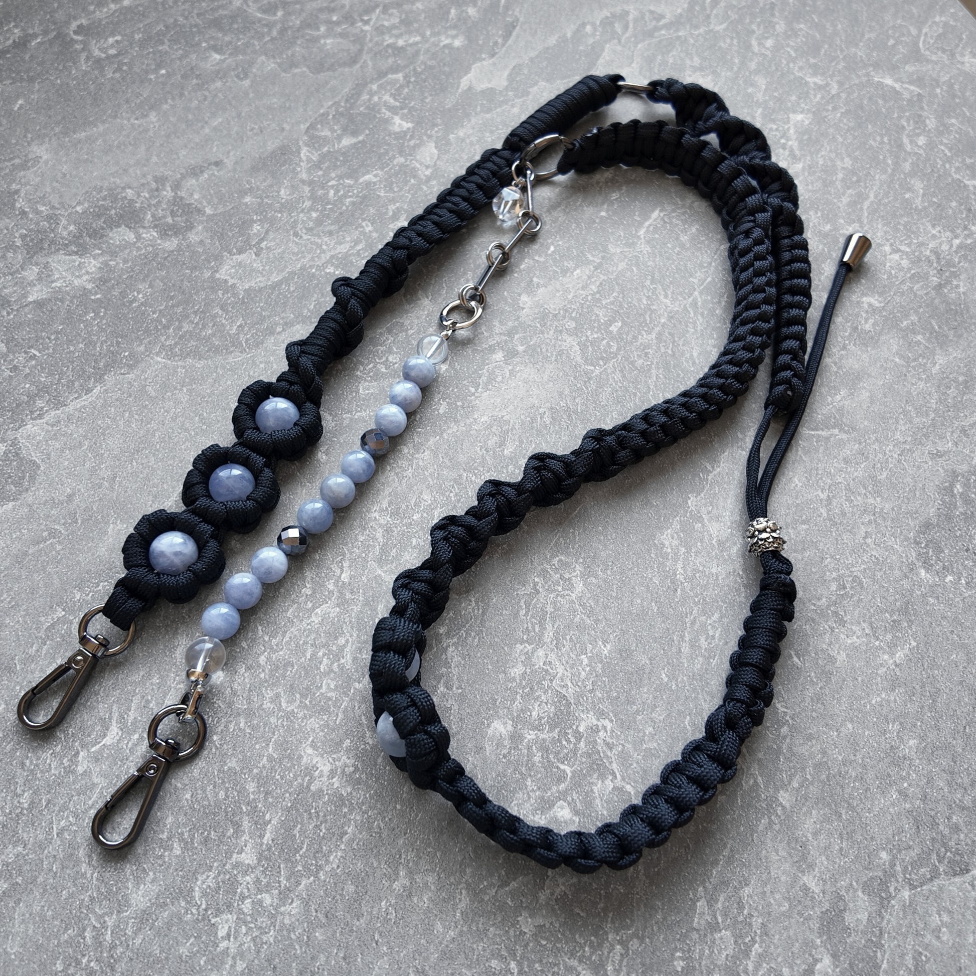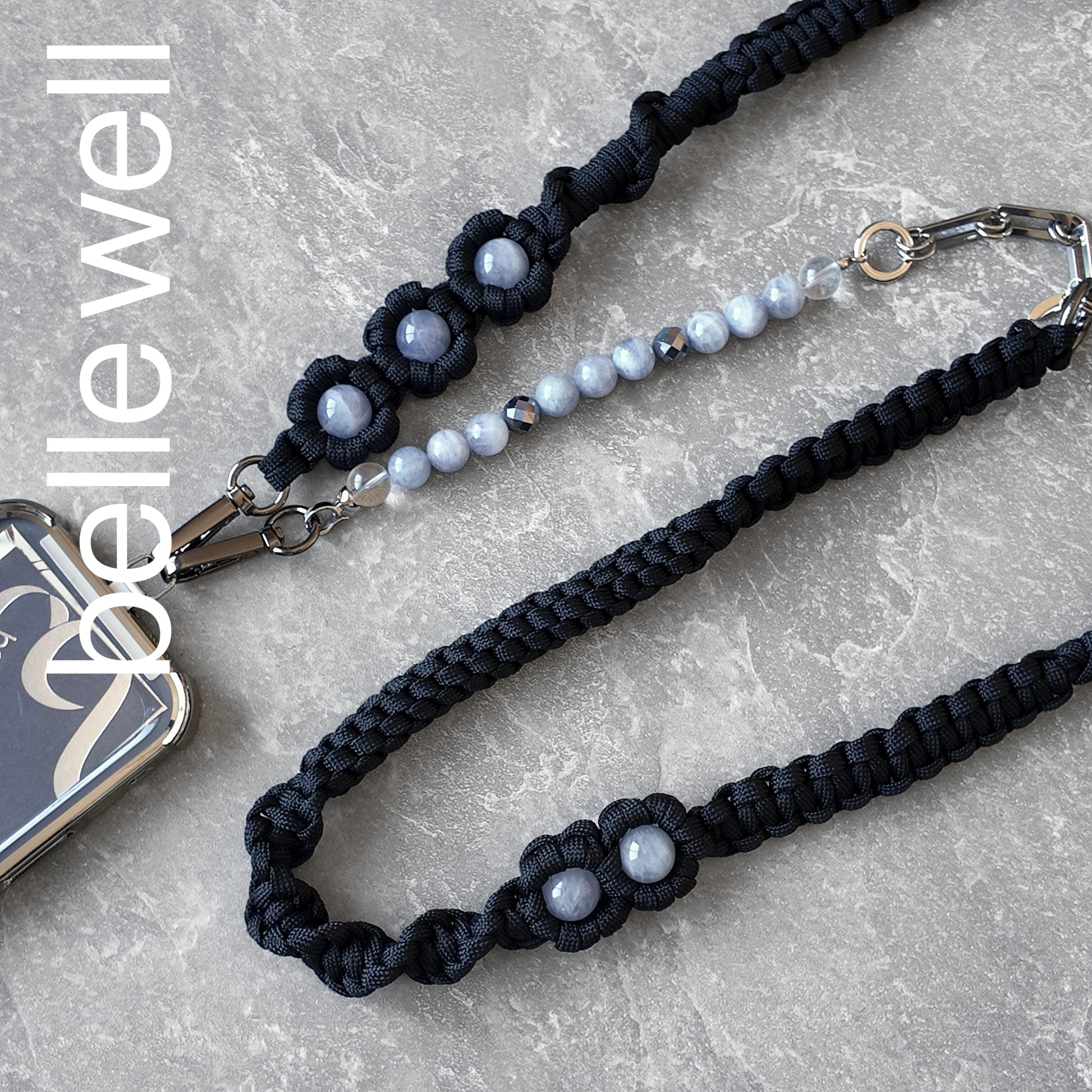 優しさと気品を兼ね備えたブルーのお色味のブルーローズクォーツ♪青の色味が良きるようにコードは黒でカッコ可愛く仕立てた多機能ショルダー♪