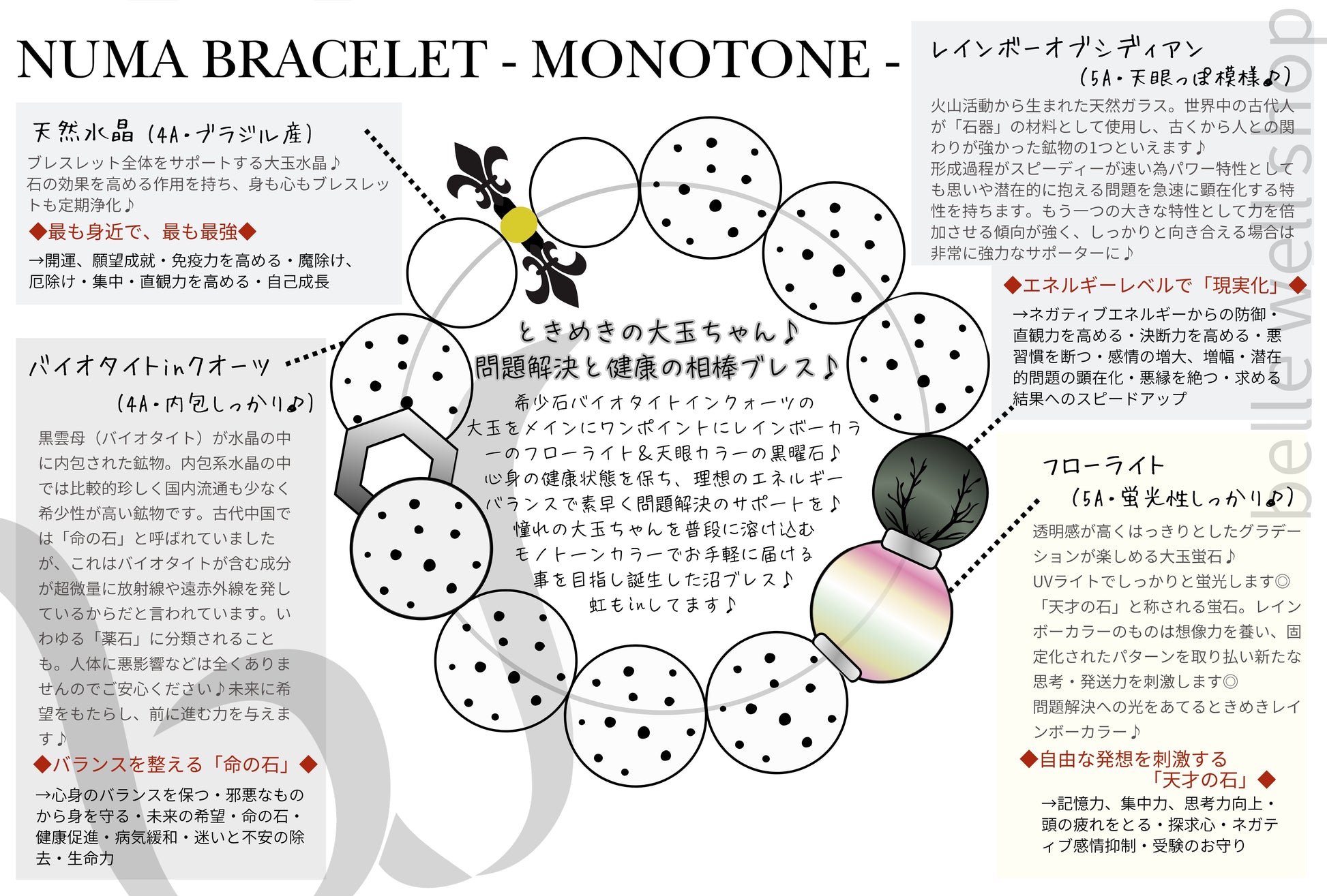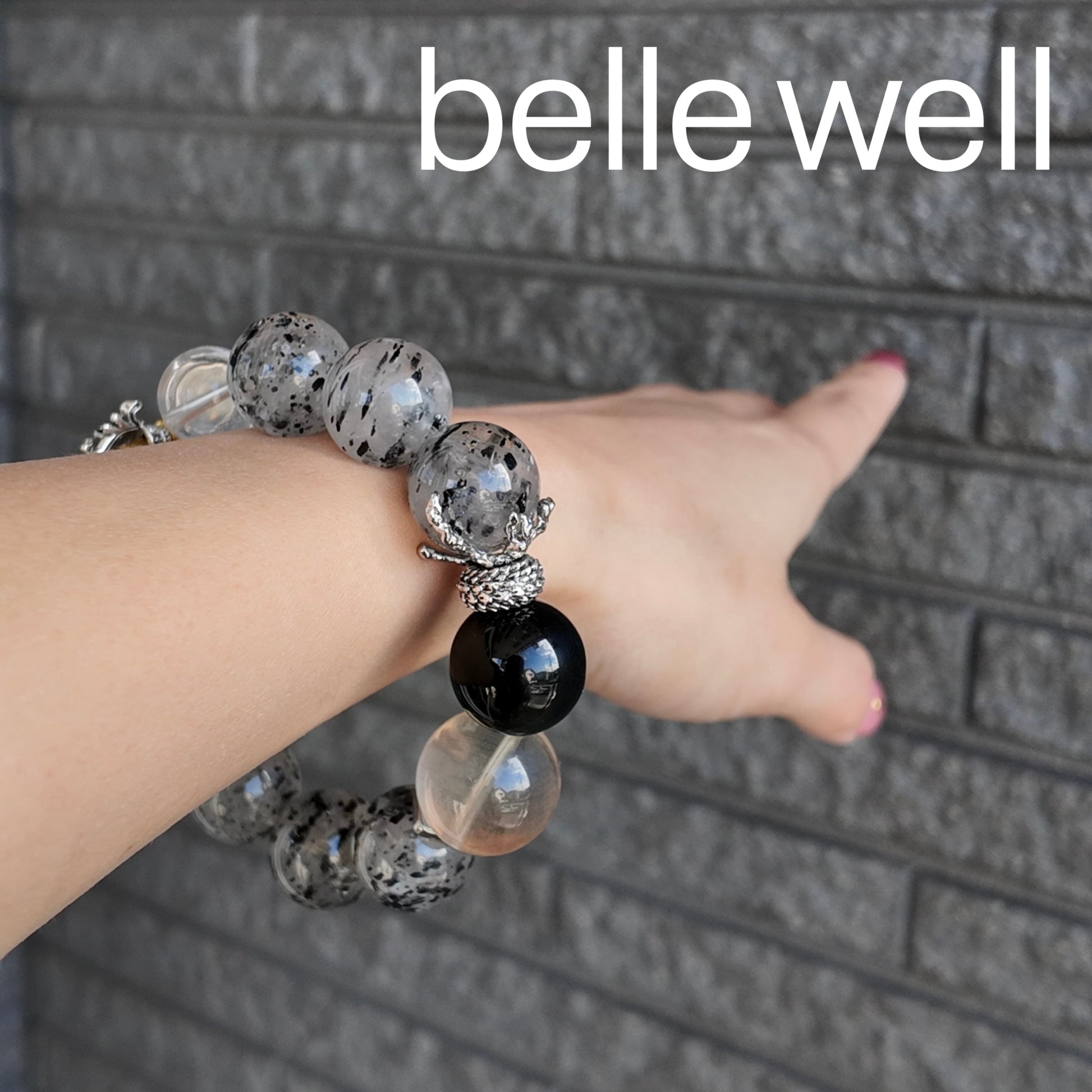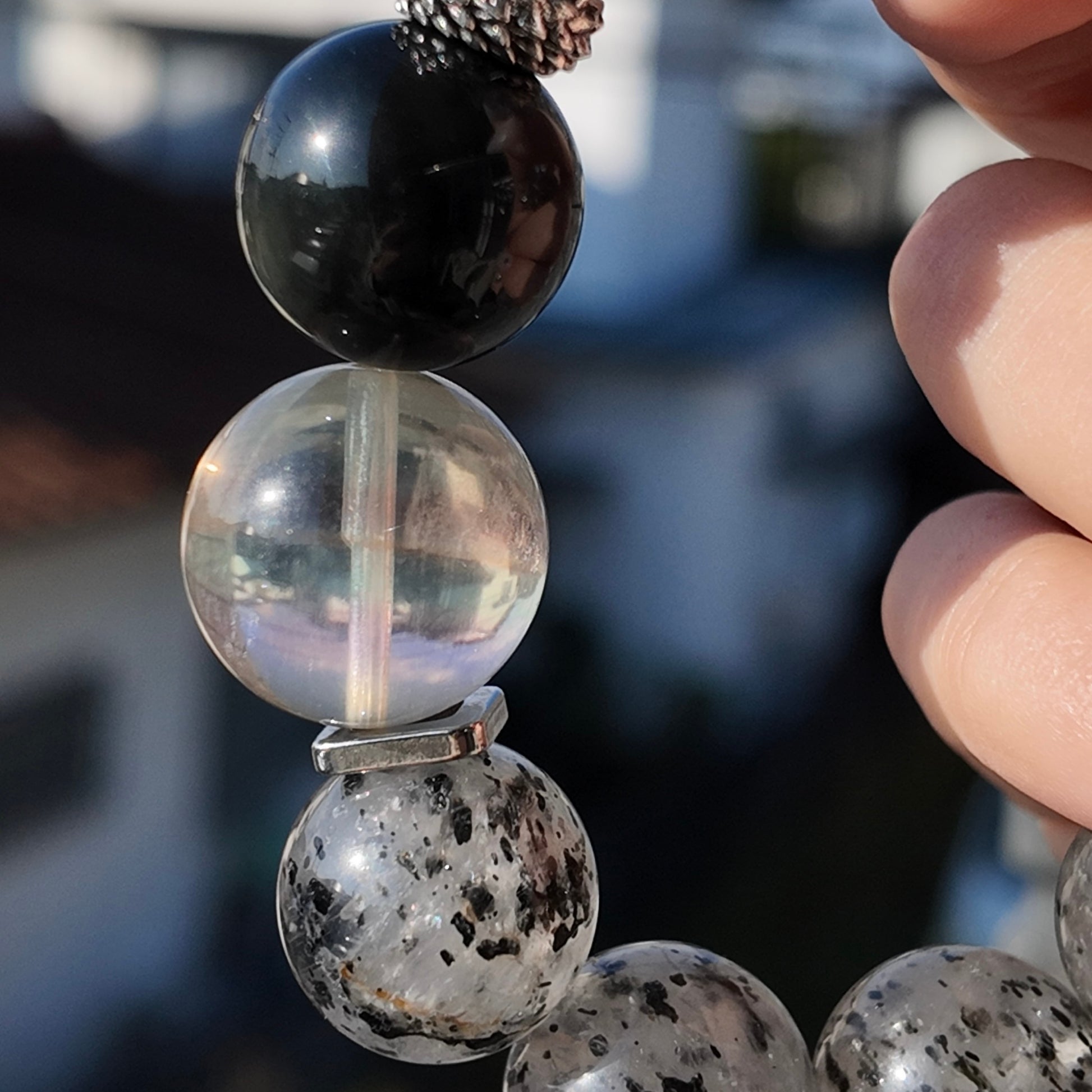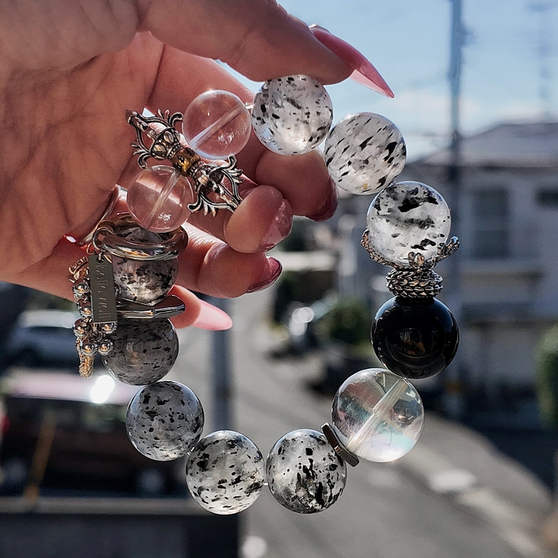 希少石バイオタイトインクォーツの大玉をメインにワンポイントにレインボーカラーのフローライト&天眼カラーの黒曜石♪心身の健康状態を保ち、理想のエネルギーバランスで素早く問題解決のサポートを♪憧れの大玉ちゃんを普段に溶け込むモノトーンカラーでお手軽に届ける事を目指し誕生した沼ブレス♪虹もinしてます♪