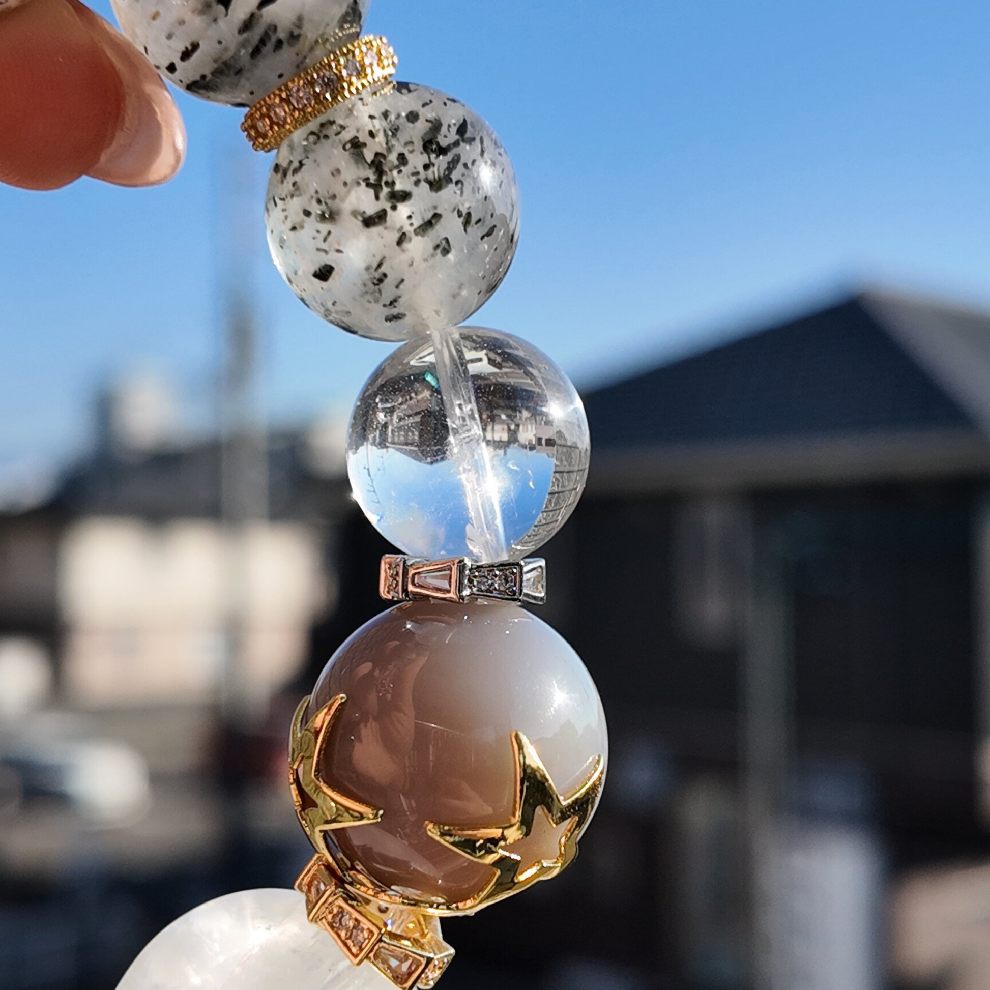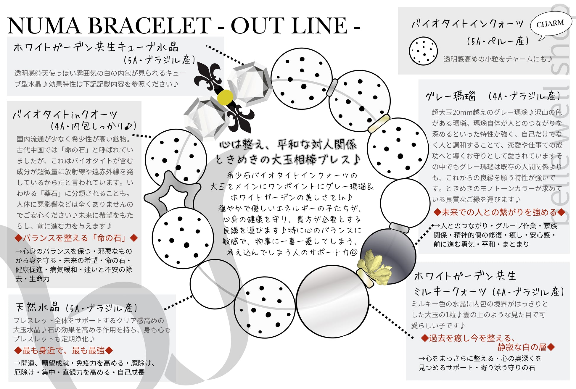 希少石バイオタイトインクォーツの大玉をメインにワンポイントにグレー瑪瑙&ホワイトガーデンの美しさをin♪穏やかで優しいエネルギーの子たちが、心身の健康を守り、貴方が必要とする良縁を運びます♪特に心のバランスに敏感で、物事に一喜一憂してしまう、考え込んでしまう人のサポート力◎