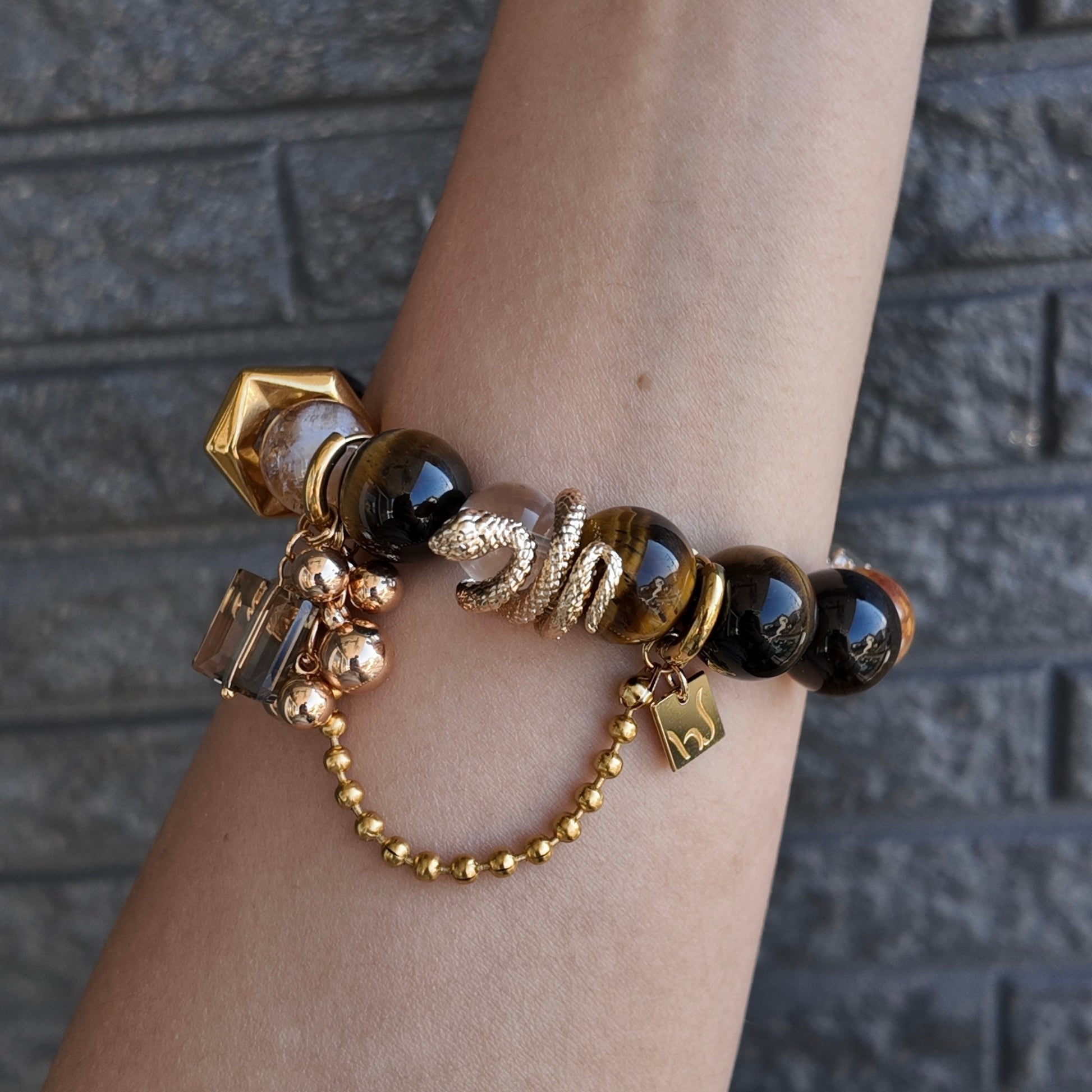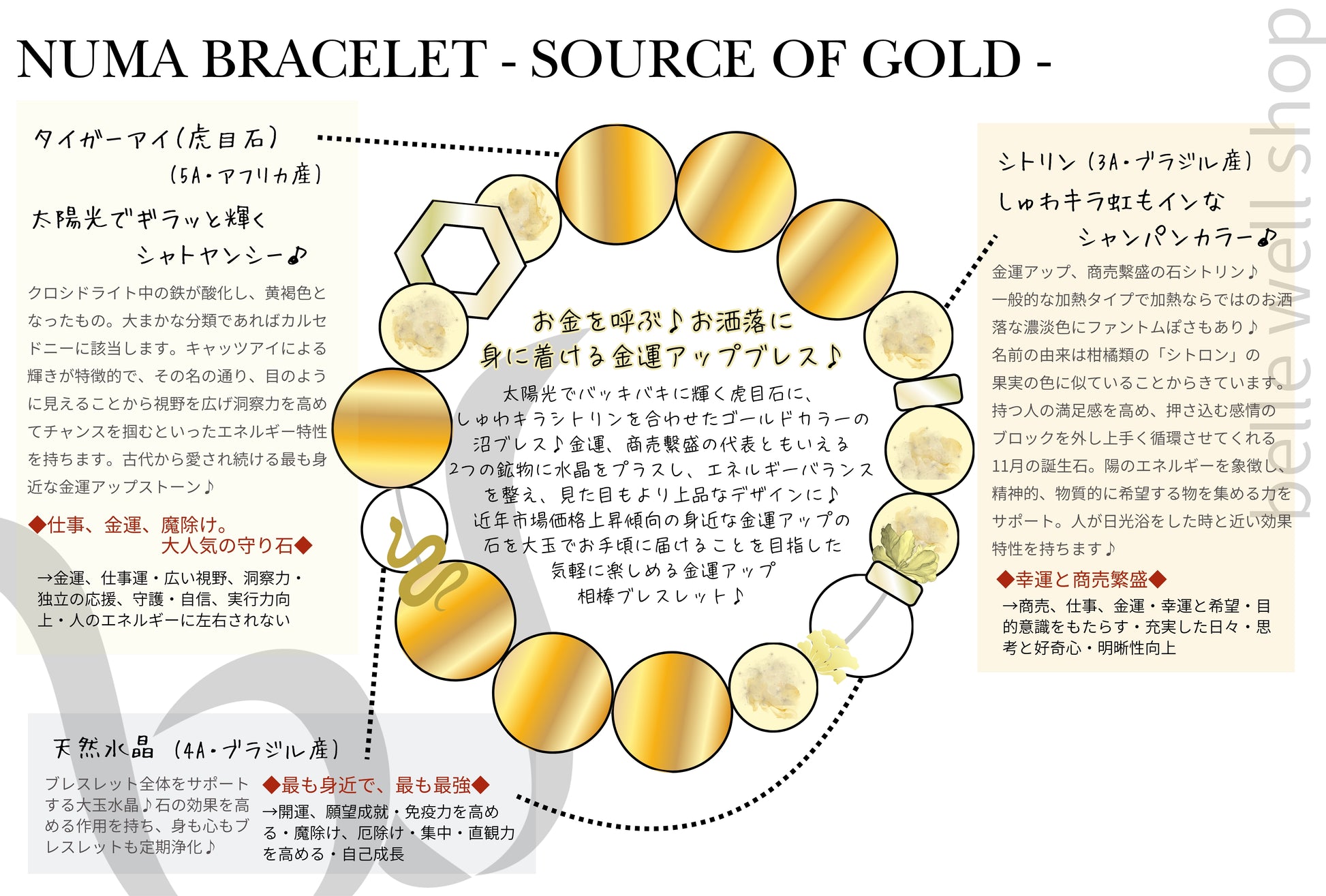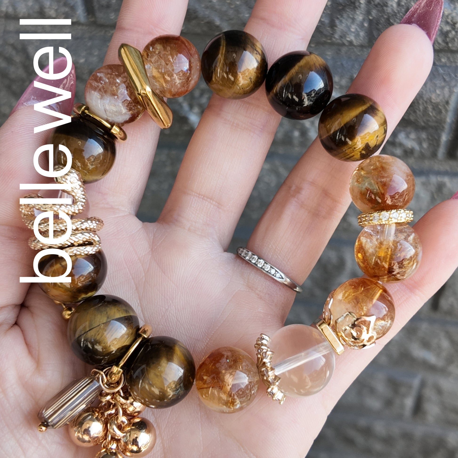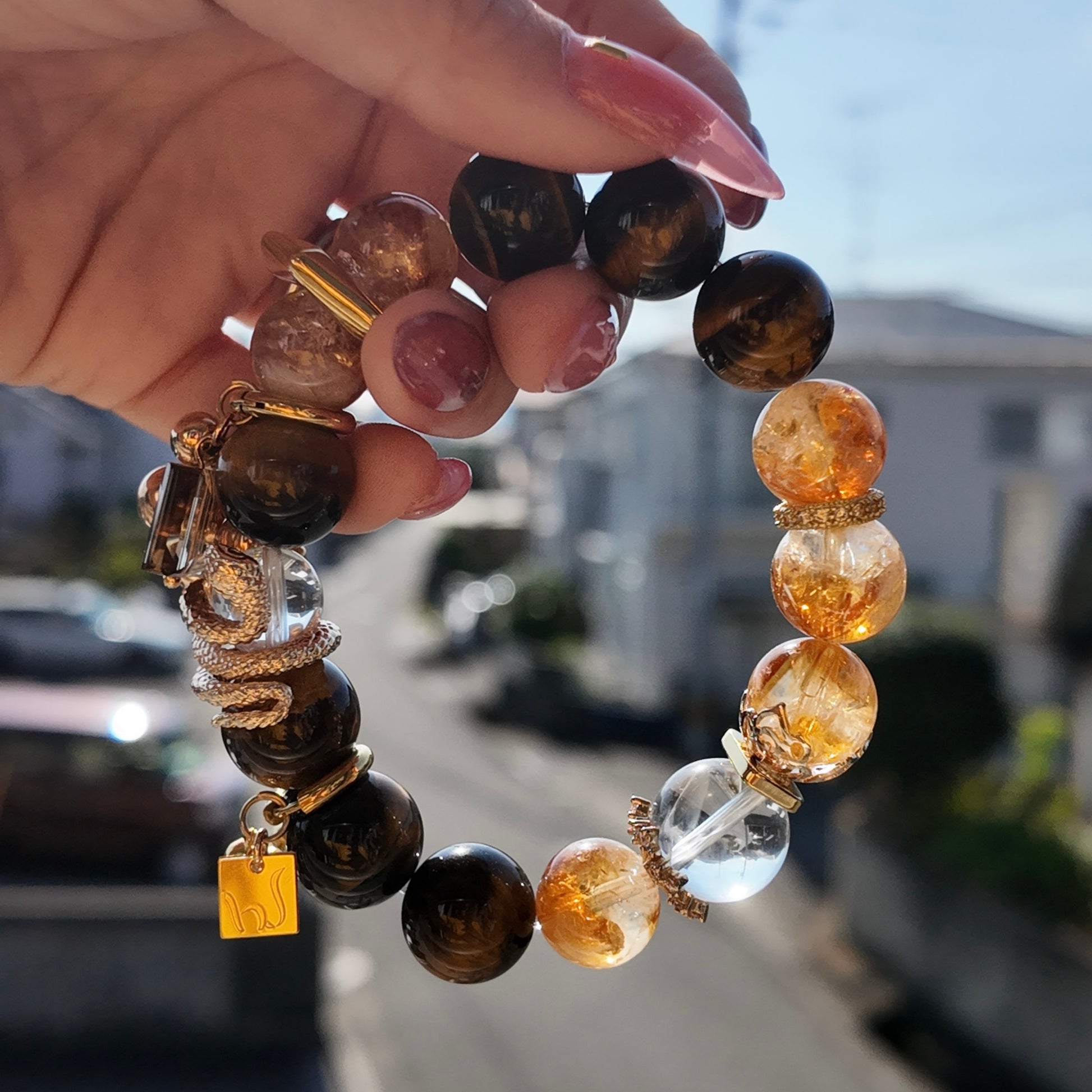 太陽光でバッキバキに輝く虎目石に、しゅわキラシトリンを合わせたゴールドカラーの沼ブレス♪金運、商売繫盛の代表ともいえる2つの鉱物に水晶をプラスし、エネルギーバランスを整え、見た目もより上品なデザインに♪近年市場価格上昇傾向の身近な金運アップの石を大玉でお手頃に届けることを目指した気軽に楽しめる金運アップ相棒ブレスレット♪