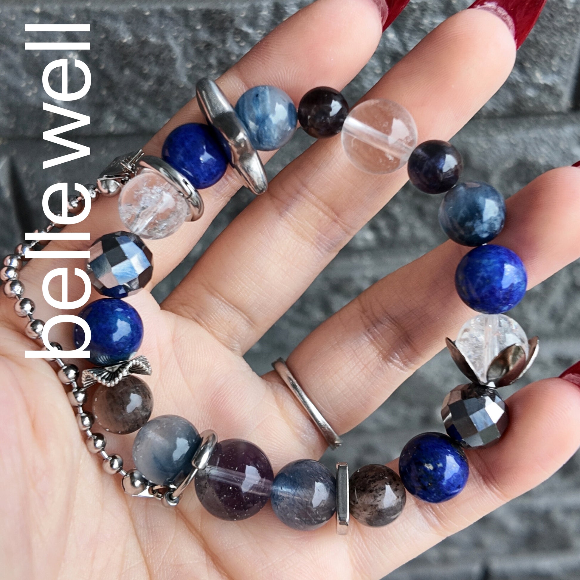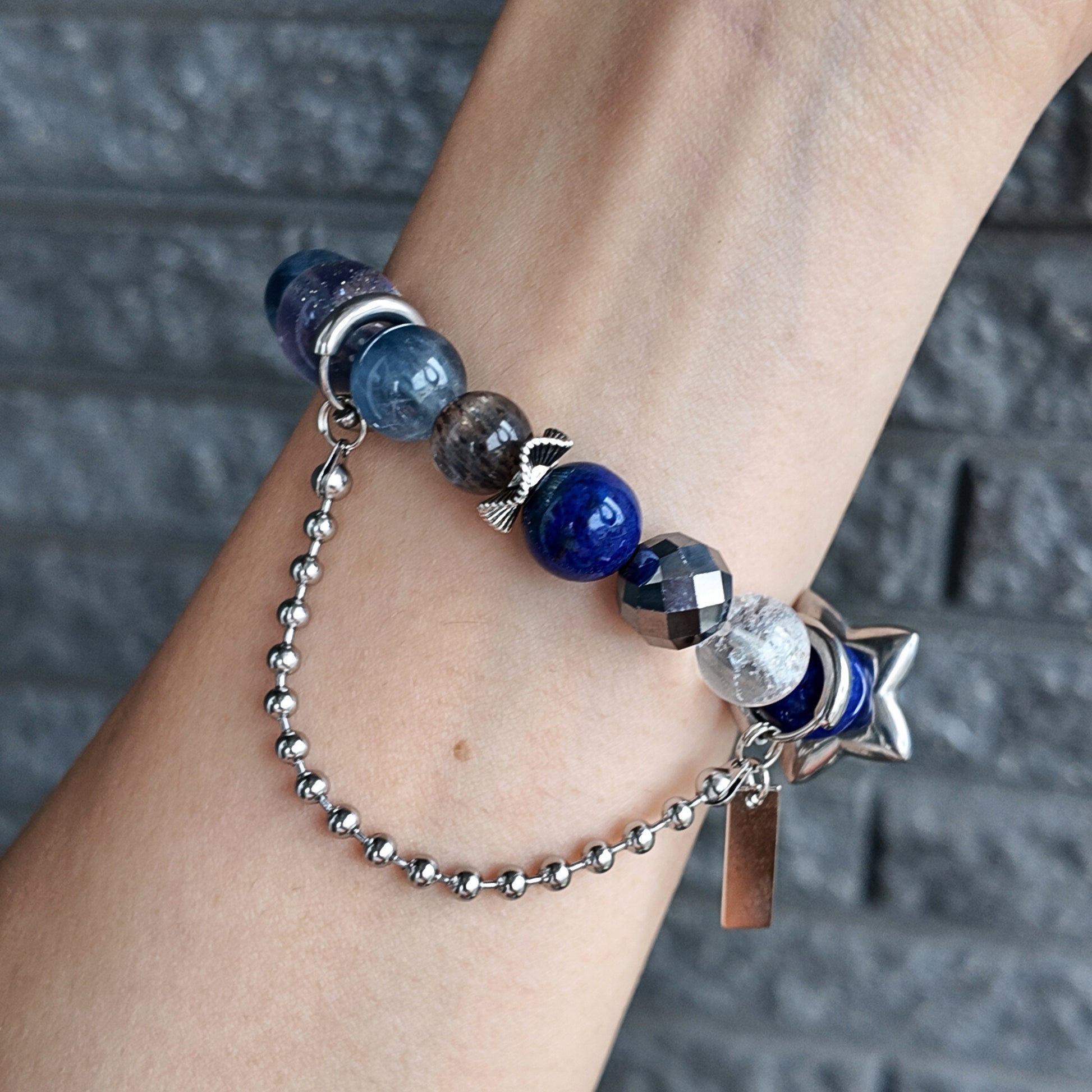 広くキラキラ星が輝く美しい夜♪「選択」の繰り返しの毎日に、直感をより研ぎ澄ませ、雑味のない思考から目的地により最適な方向へ前進できるよう、道の案内人的存在です♪総合的な運気を考慮し、ただ選ぶだけでなく自身で選択肢を増やしていけるような可能性にも目を向けた頼りがいのある導き相棒ブレスレット♪